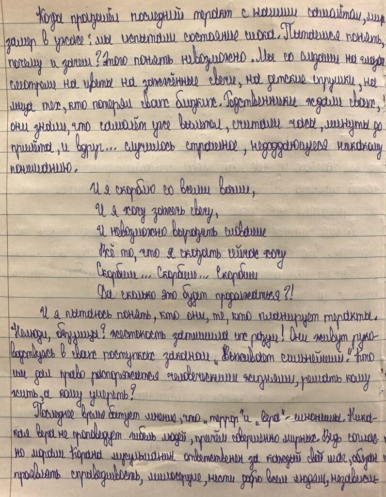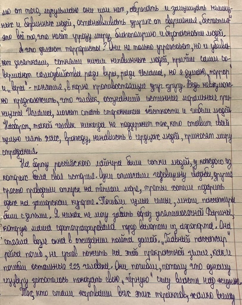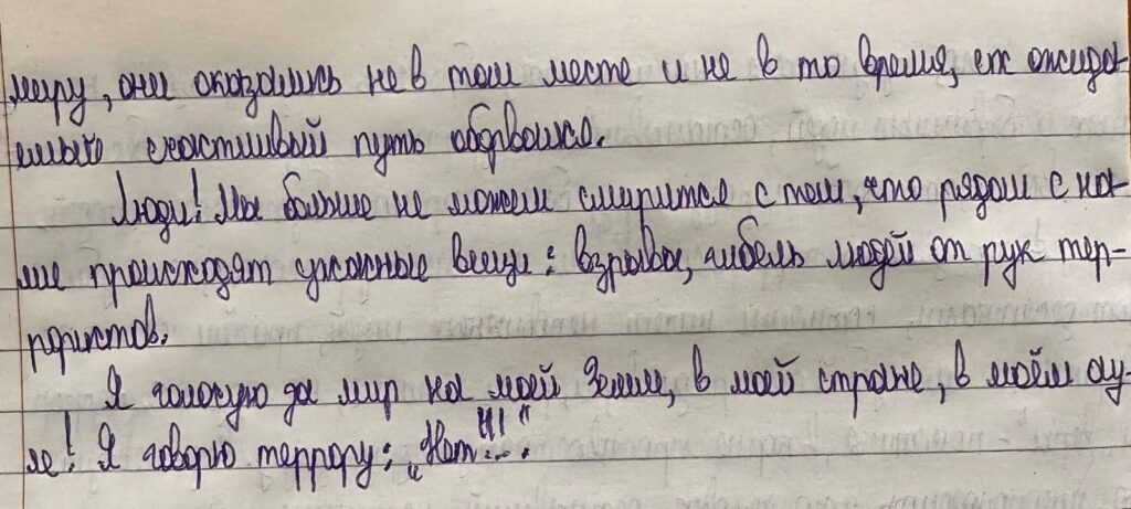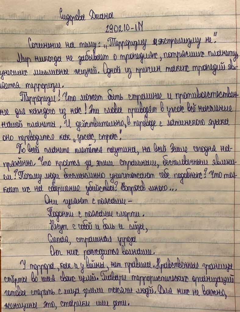 В современном обществе особую актуальность приобретает проблема борьбы с терроризмом. Это вызывает необходимость разработки и внедрения мероприятий антитеррористической направленности в различных сферах жизни. 9-14 сентября в Казанском колледже технологии и дизайна прошла декада противодействия терроризма и экстремизма, целью которой стало создание атмосферы нетерпимости населения к проявлениям террористической и экстремисткой идеологии, воспитание у молодежи традиционных духовно-нравственных ценностей. Студенты групп 29.02.10-1(Ш), 29.02.10-1(М), 29.01.34-1, 29.02.02-1, 09.02.07-1ВБ приняли активное участие в конкурсе сочинений «Терроризму и экстремизму — нет!» Мероприятие направлено на профилактику противодействие идеологии экстремизма и терроризма, а также на воспитание у молодежи уважения к ценности мирной жизни.