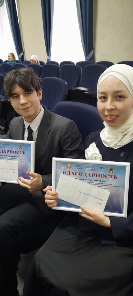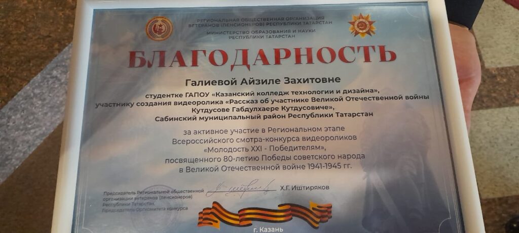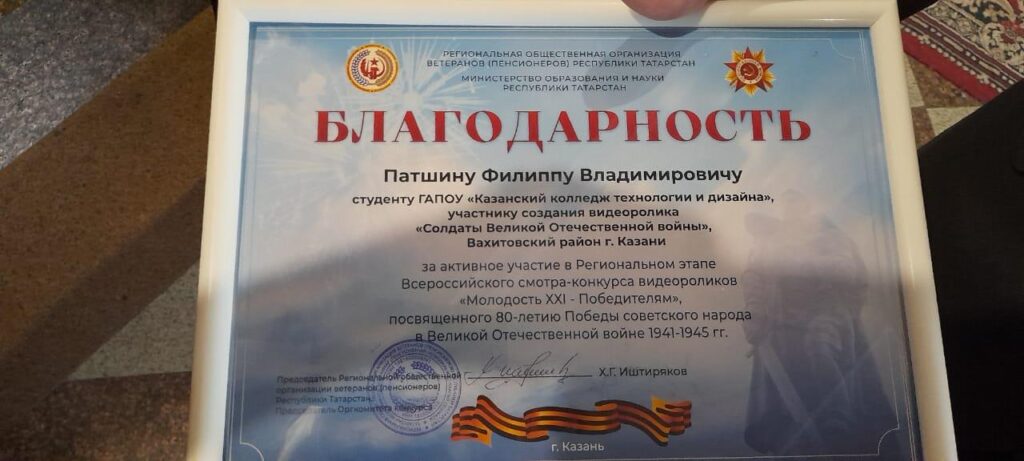 Подведены итоги всероссийского смотра- конкурса видео-роликов » Молодость ХХ1- Победителям» в честь 80-летия Победы советского народа в Великой Отечественной войне 1941-1945 годов. В Министерстве Культуры вручали награды победителям и призерам регионального этапа конкурса. В числе награжденных студенты Казанского колледжа технологии и дизайна Патшин Филипп и Галиева Айзиля, которые в рамках урока истории, под руководством Дорохина Эдуарда Анатольевича, подготовили видео-ролики о своих предках- участниках и героях Великой Отечественной войны и отмечены призами конкурса. Организатор — Общественная организация ветеранов Республики Татарстан, отметили Казанский колледж технологии и дизайна в числе активных участников конкурса.