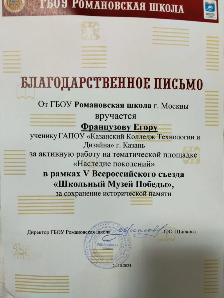Команда нашего колледжа стала Победителем Всероссийского конкурса История Большой страны и принимает участие во всероссийском съезде школьных и студенческих музеев в городе Москва В Москву отправились руководитель Историко Патриотического Клуба «За Родину!» Дорохин Эдуард Анатольевич и один из участников проекта Французов Егор 25 октября состоится торжественное награждение победителей в Центральном Музее Победы В Музее Победы прошла торжественная церемония открытия Всероссийского съезда «Школьный Музей Победы». «Юные музейщики, хранители истории, добро пожаловать в Москву, в Музей Победы! Уверен, что вы почувствуете, как кипит здесь творческая энергия, найдете единомышленников, поделитесь друг с другом знаниями и идеями. Мы готовы поддержать все инициативы и проекты, которые помогут сделать школьные музеи более современными и даже новаторскими», — обратился к участникам съезда генеральный директор Музея Победы, заместитель секретаря Общественной палаты РФ Александр Школьник. «Нашей программе «Школьный Музей Победы» пять лет. Она бодро шагает по стране и устремляется за ее пределы, вовлекая в свои ряды увлеченных ребят. Съезд — возможность сообща сгенерировать новые смыслы, подумать о том, как развивать программу дальше, как заинтересовывать школьников героической историей родного края и подвигами предков», — добавил генеральный директор Музея Победы. На съезд приехали активисты школьных музеев из 53 регионов России — победители Всероссийского конкурса «История большой страны». В их числе — делегация музея школы № 115 города Донецка (Донецкая Народная Республика). «Мы посвятили наш музей героям-ополченцам, которые еще в 2014 году встали на защиту родного края. Сейчас у нас собрана информация о порядка 20 ополченцах 2014 года и участниках специальной военной операции. Представлять наш музей на съезде в Музее Победы — это великая радость, память на всю жизнь», — поделилась руководитель донецкого школьного музея Наталья Дочкина. «У меня с участием в жизни школьного музея связана личная история. Мой родной брат Андрей Пасечник ушел на СВО в 2022 году и, защищая нашу Родину, погиб в Луганской Народной Республике. Я подготовила его историю для нашего музея, передала туда его награды, чтобы все им гордились, как горжусь им я, и чтобы как можно больше людей узнали о нем», — рассказала активистка донецкого школьного музея Полина Дьяченко. Торжественную церемонию открытия Всероссийского съезда «Школьный Музей Победы» провели директор Детского центра Музея Победы Елена Слесаренко и поэт, актер и режиссер Влад Маленко. Почетными гостями мероприятия стали участник войны в Афганистане Герой Советского Союза Вячеслав Черножуков, первый заместитель председателя Совета ветеранов Московской городской общественной организации ветеранов войны, труда, Вооруженных Сил и правоохранительных органов Расим Акчурин, подполковник медицинской службы Герой России Владимир Белов, председатель правления Российского исторического общества, исполнительный директор фонда «История Отечества» Руслан Гагкуев, участники СВО и другие. С приветственным словом к делегатам съезда обратились ветеран Великой Отечественной войны Иван Гришанов и Герой России, участник специальной военной операции Владислав Головин. «Атмосфера, которой сего